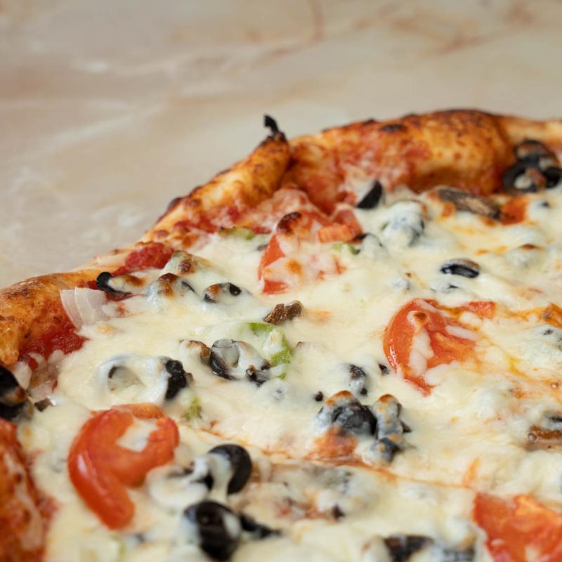Pizza sauce, mozzarella cheese, onion, mushrooms, bell pepper, black olives & tomato.